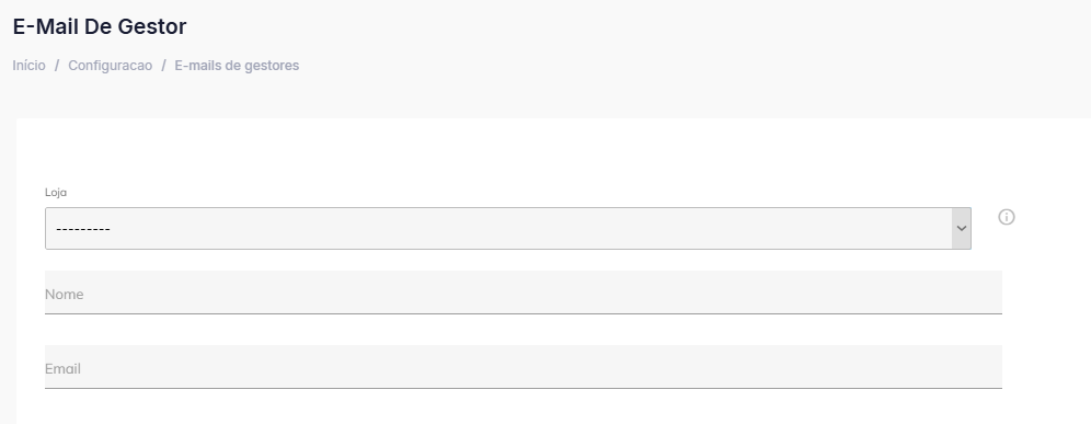 Para cadastrar os e-mails de gestores vá no menu "Configurações" e depois em "E-mails de gestores". Clique em adicionar e realize o cadastro do e-mail desejado.