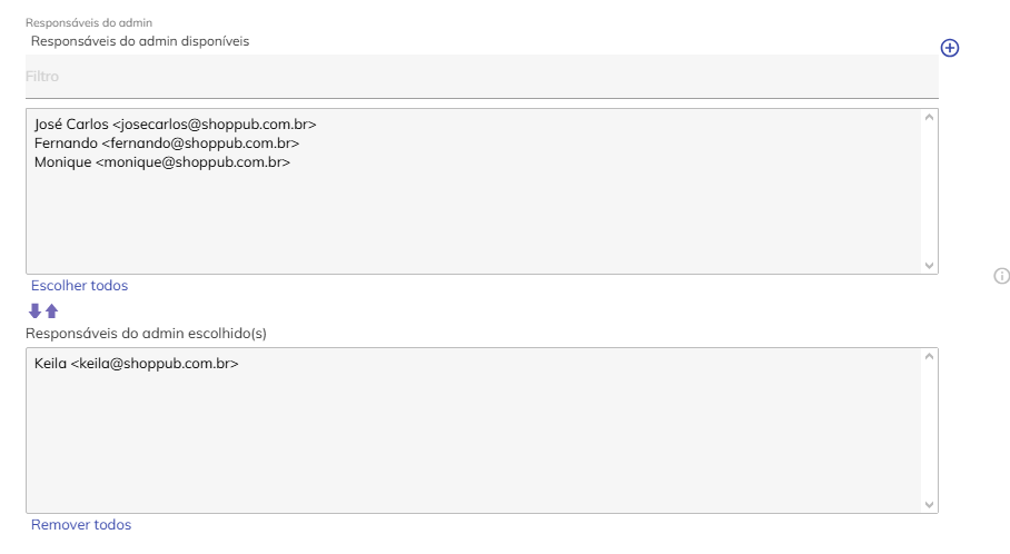 Após salvar, vá para a página de "E-mails transacionais" ainda no menu "Configurações". Por padrão a coluna "administradores", estará em branco ou com o e-mail da Shoppub. Clique nos e-mail um a um, e altere esta informação para um dos e-mails de gestores da sua loja.