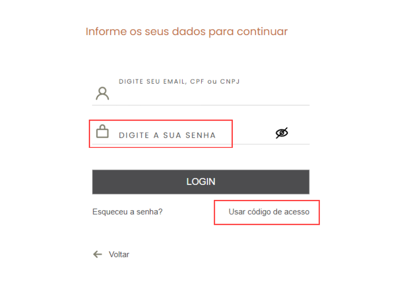 Neste mesmo acesso do login, é possível migrar para o uso de senha, assim como, optar pelo uso do código. Fica a escolha do cliente.